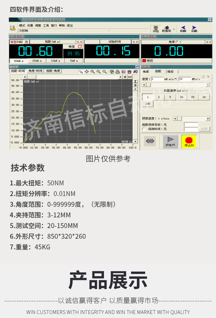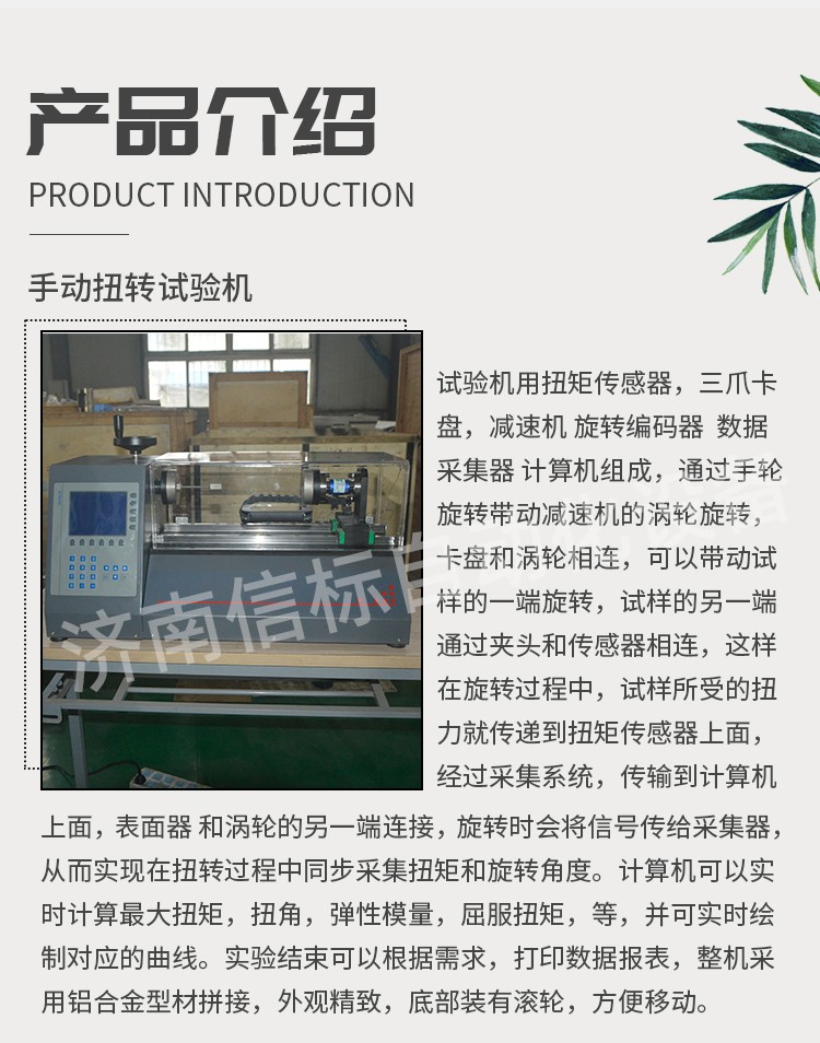 試驗機用扭矩傳感器,三爪卡盤,減速機 旋轉編碼器  數據采集器 計算機組成,通過手輪旋轉帶動減速機的渦輪旋轉,卡盤和渦輪相連,可以帶動試樣的一端旋轉,試樣的另一端通過夾頭和傳感器相連,這樣在旋轉過程中,試樣所受的扭力就傳遞到扭矩傳感器上面,經過采集系統,傳輸到計算機上面,表面器 和渦輪的另一端連接,旋轉時會將信號傳給采集器,從而實現在扭轉過程中同步采集扭矩和旋轉角度。計算機可以實時計算最大扭矩,扭角,彈性模量,屈服扭矩,等,并可實時繪制對應的曲線。實驗結束可以根據需求,打印數據報表,整機采用鋁合金型材拼接,外觀精致,底部裝有滾輪,方便移動,更多金屬線材扭轉試驗機資料請聯系我們濟南信標自動化設備有限公司。專業生產液壓萬能試驗機,疲勞試驗機,扭轉試驗機,高溫蠕變試驗機,彈簧試驗機,彎曲試驗機,沖擊試驗機,彎曲強度試驗機,抗拉強度試驗機等。