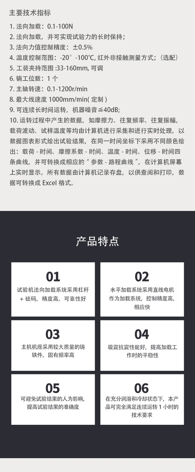 試驗機主機主要由主機機座、水平機座、法向主軸及其驅動系統、試驗力施加裝置、摩擦扭矩及位移高精度傳感測量系統、試驗力測量及摩擦溫度測量系統等組成;試驗機法向加載系統采用杠桿+砝碼,精度高,可靠性好;水平加載系統采用直線電機作為加載系統,控制精度高,相應快,主機機座采用較大質量的鑄鐵件,固有頻率高,吸震抗震性能好,箱體座也是采用鐵件經數控鏜加工后將電主軸牢固鎖緊在箱體座中,這樣可以提高加載工作時的平穩性。