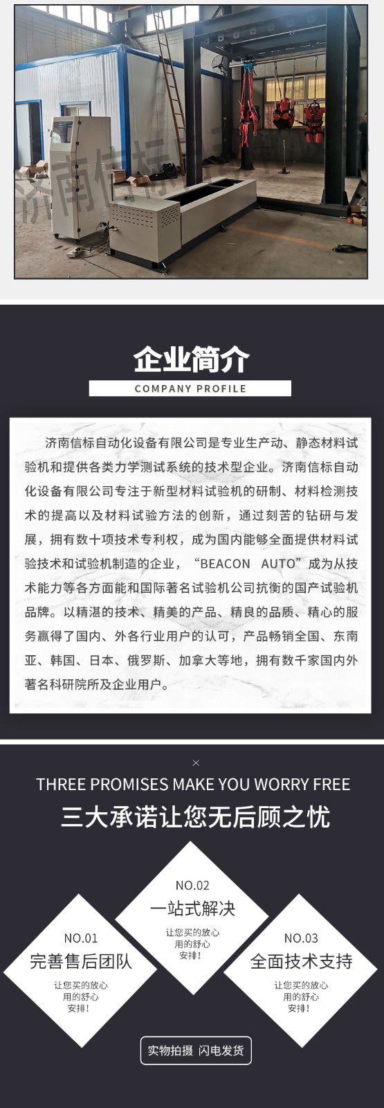 濟南信標自動化設備有限公司主要生產:動靜態萬能疲勞試驗機,接骨板彎曲試驗機,縫合線拉伸疲勞試驗機,髖膝關節磨損試驗機,電子萬能試驗機、液壓萬能試驗機、巖石三軸、四軸,電液拉力試驗機,材料試驗機,高低溫蠕變,高低頻疲勞,拉伸、扭轉、杯突等二十多個系列兩千多個的品種。