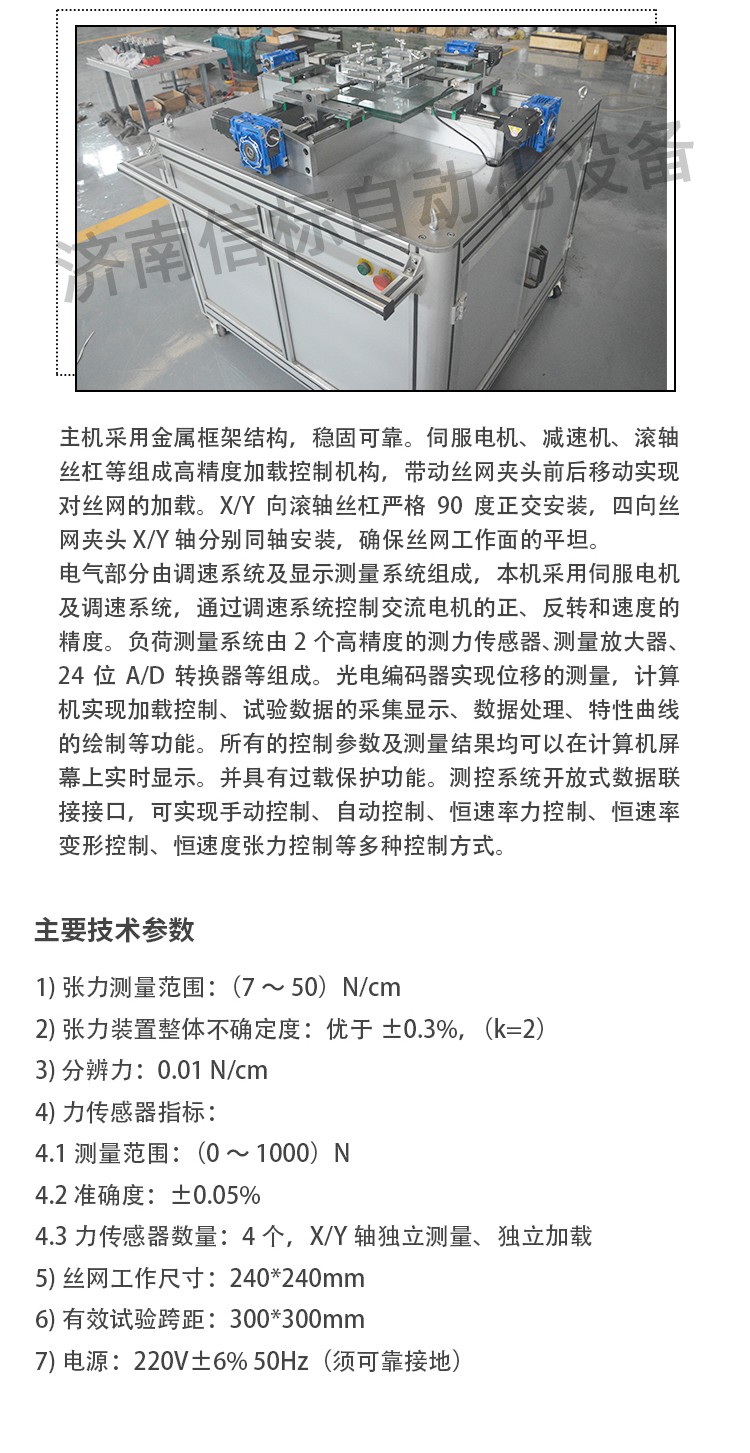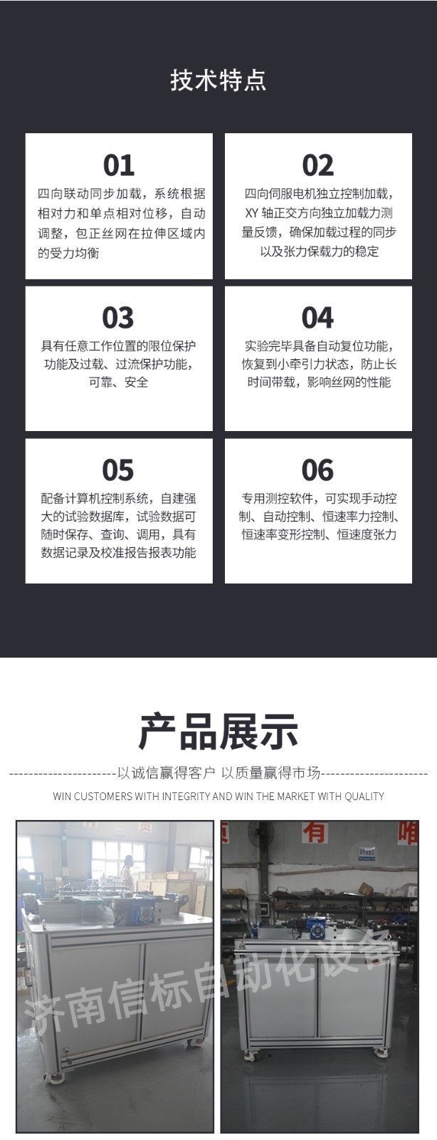 1) 四向聯動同步加載,系統根據相對力和單點相對位移,自動調整,包正絲網在拉伸區域內的受力均衡,較老式機械加載有本質區別,軟件內部增加縱橫纖維相對力補償算法),保證對絲網加載過程的四個方向受力均勻。